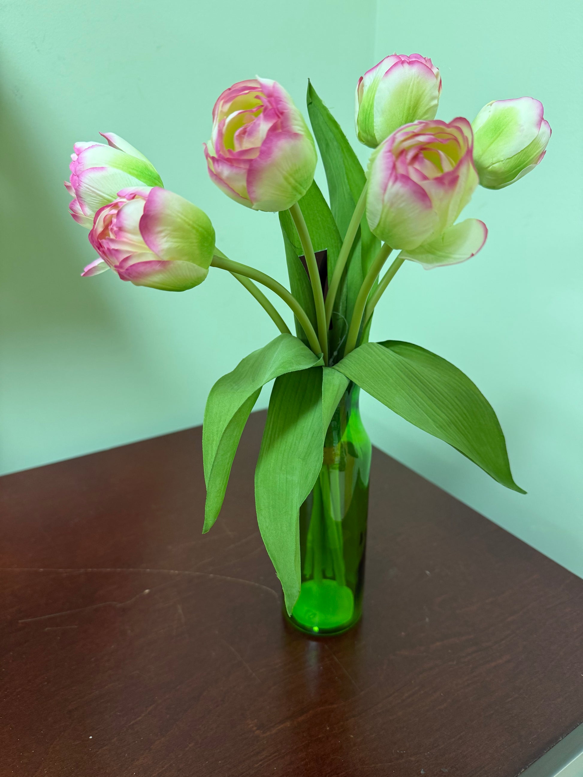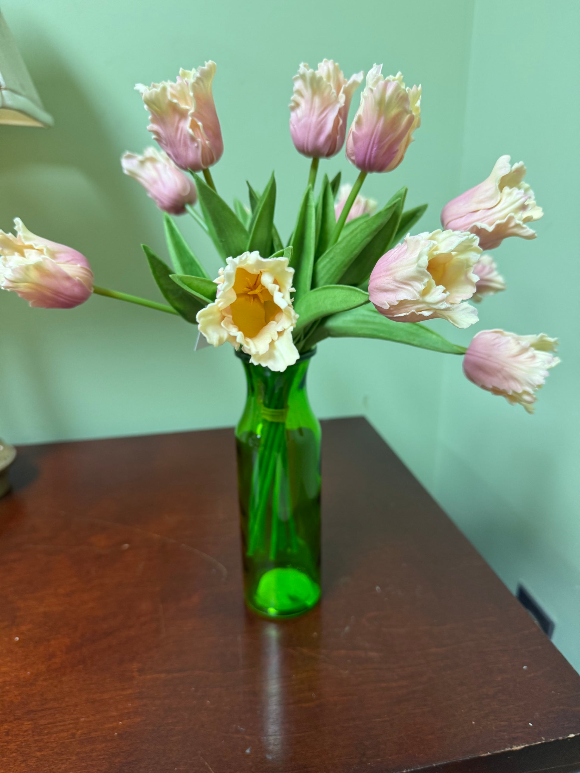 This artificial arrangement is perfect for ICU loved ones. Simple, yet beautiful Parrot or Traditional Tulip blooms. These flowers feel real but last a lifetime and never need water. Arrangement is over 12" tall.