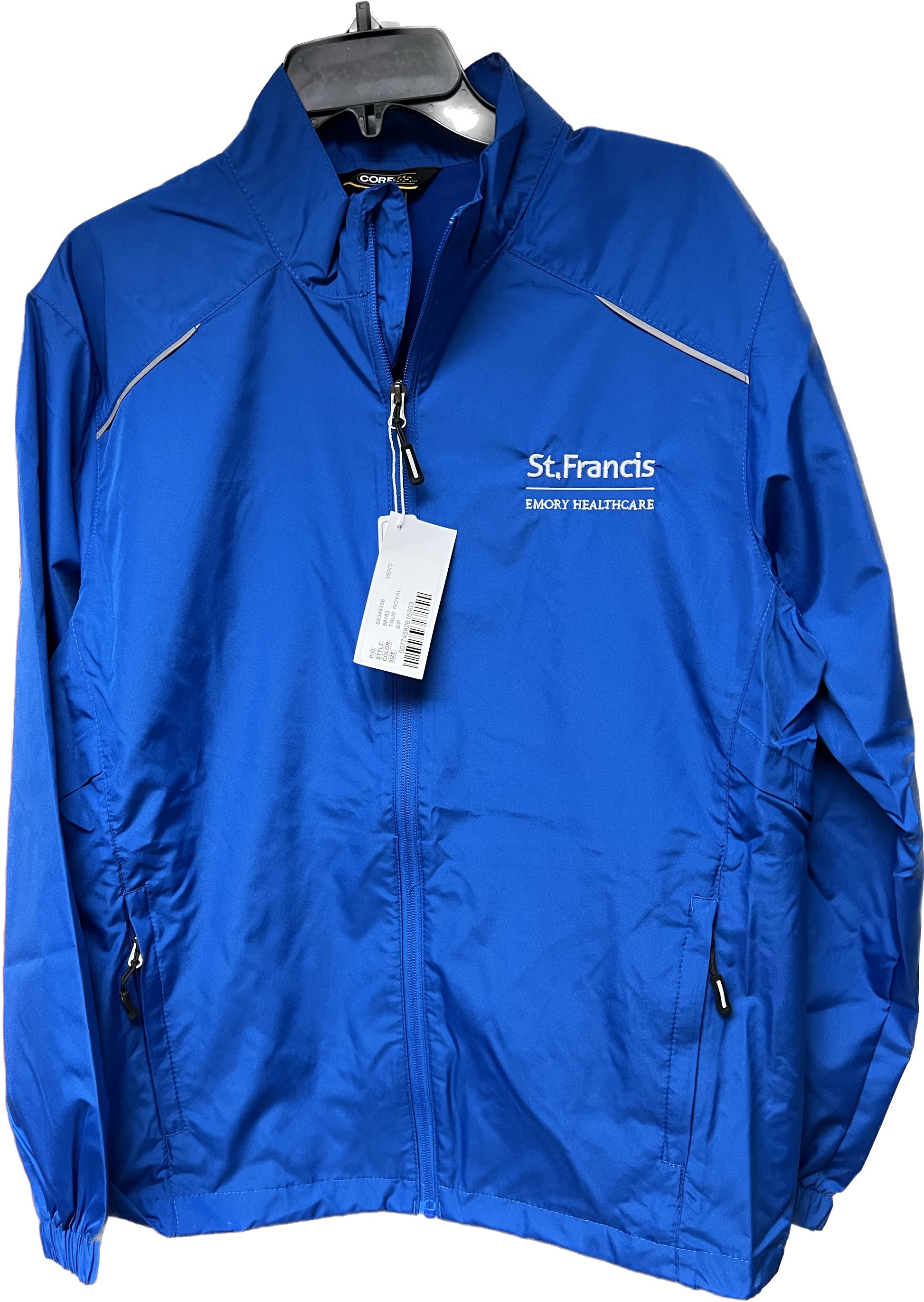 This Core365 lightweight royal blue jacket with white embroidered logo is reflective, water resistant, and has audio ports. Machine wash cold and mild detergent. Separately in gentle cycle. Tumble dry low. Remove properly or touchup with cool iron face side only. Made in Bangladesh.